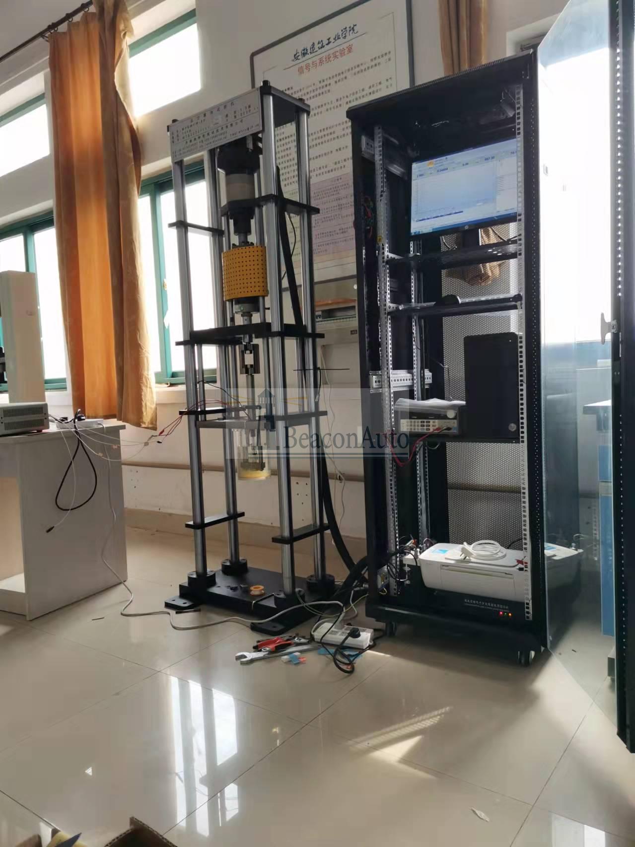 1)加載系統(tǒng)由機(jī)械傳動單元、電氣控制驅(qū)動單元和測控軟件單元組成。機(jī)械傳動單元選用精密滾珠絲杠、臺灣行星輪減速機(jī)和日本松下動單元作為基本的驅(qū) 動加載單元,加載平穩(wěn),長期穩(wěn)定性好。測控單元選用負(fù)荷傳感器(美國)、光柵 位移傳感器和 STC800 控制系統(tǒng)組成,該系統(tǒng)經(jīng)過長期使用證明,測控精度高、性能穩(wěn)定。