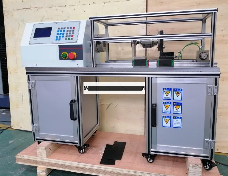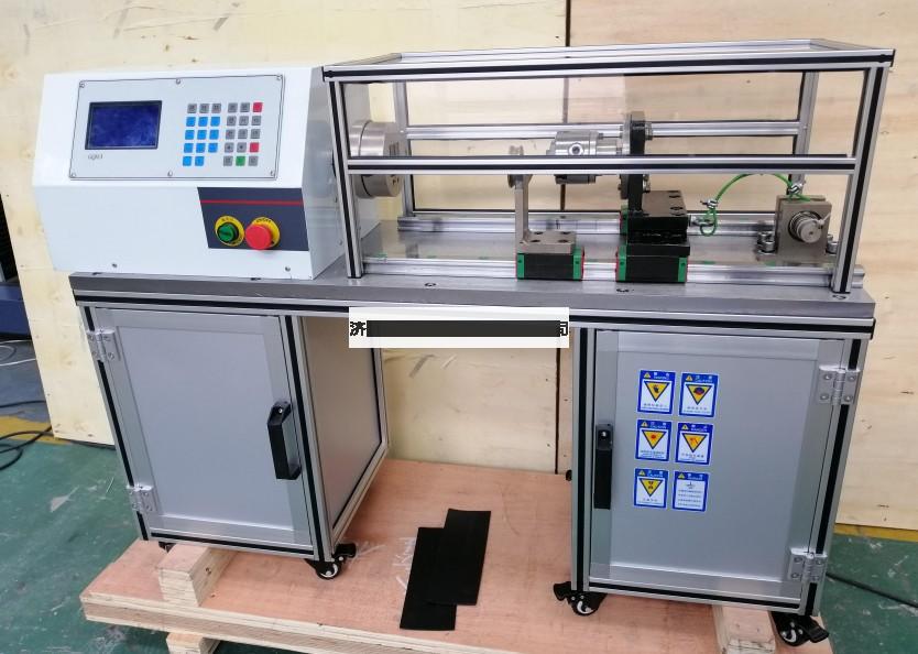 該機(jī)型采用高性能交流電機(jī)作為動(dòng)力輸出,配以高精度減速電機(jī),從而使動(dòng)力能平穩(wěn)輸出。電機(jī)的驅(qū)動(dòng)采用高可靠、高穩(wěn)定變頻器,提高機(jī)器運(yùn)行的平順性,降低功耗。一側(cè)夾頭固定在電機(jī)輸出軸,另一側(cè)夾頭固定在可移動(dòng)軸承座。移動(dòng)座采用直線軸承,摩擦阻力小,保證了軸向移動(dòng)的平直度。軸向拉緊力采用砝碼施加,通過(guò)10:1的L型杠桿,將作用力施加在線材上。